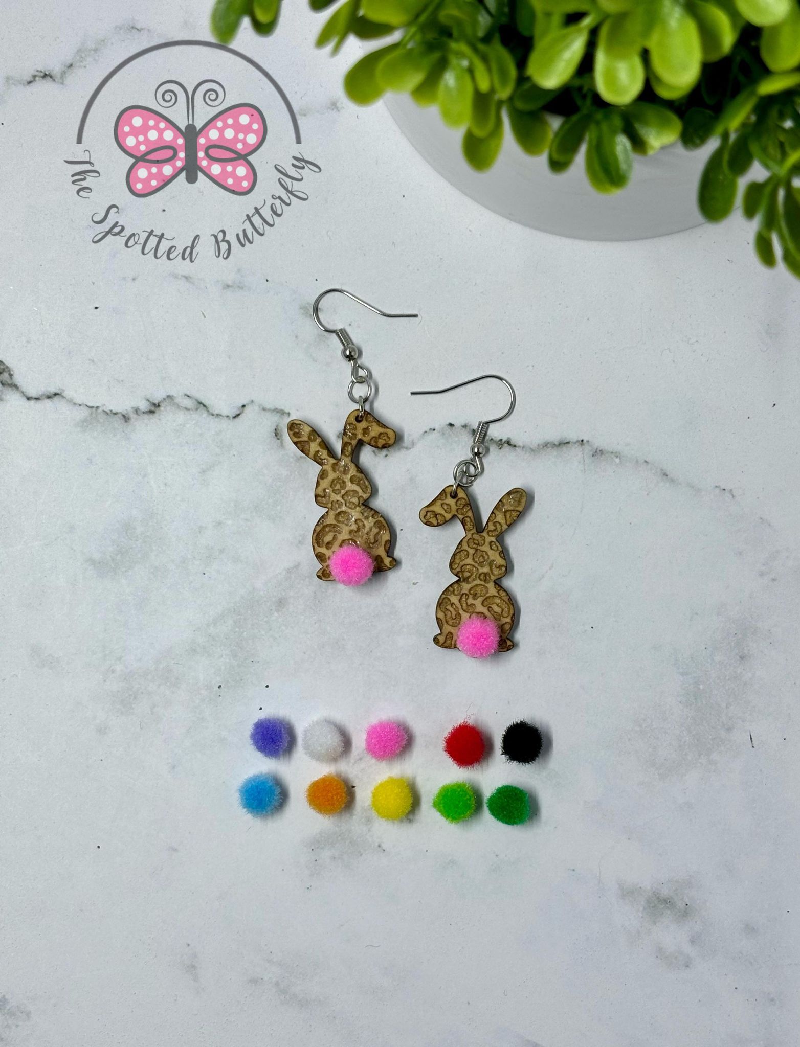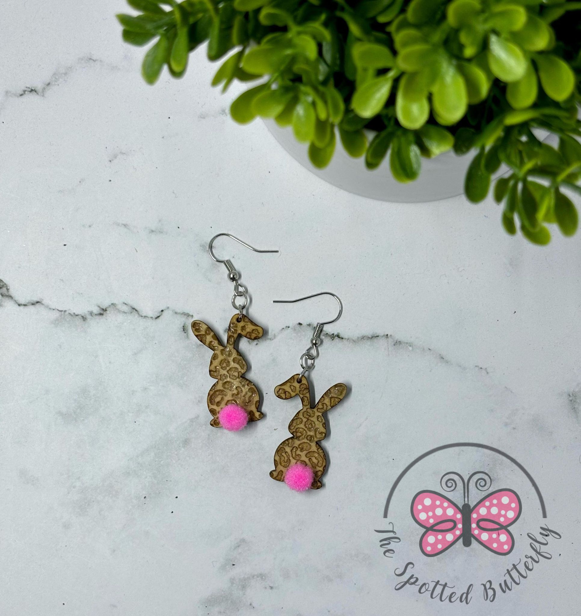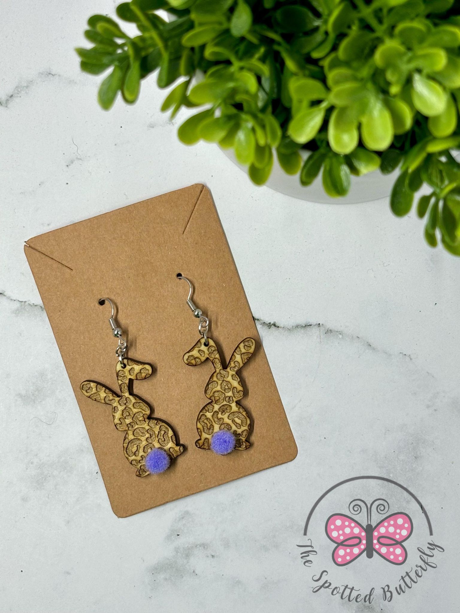 Wooden Dangle Bunny Earrings. These have the leopard print engraved in them and you can choose if you would like the tail painted or if you would like a puff ball!