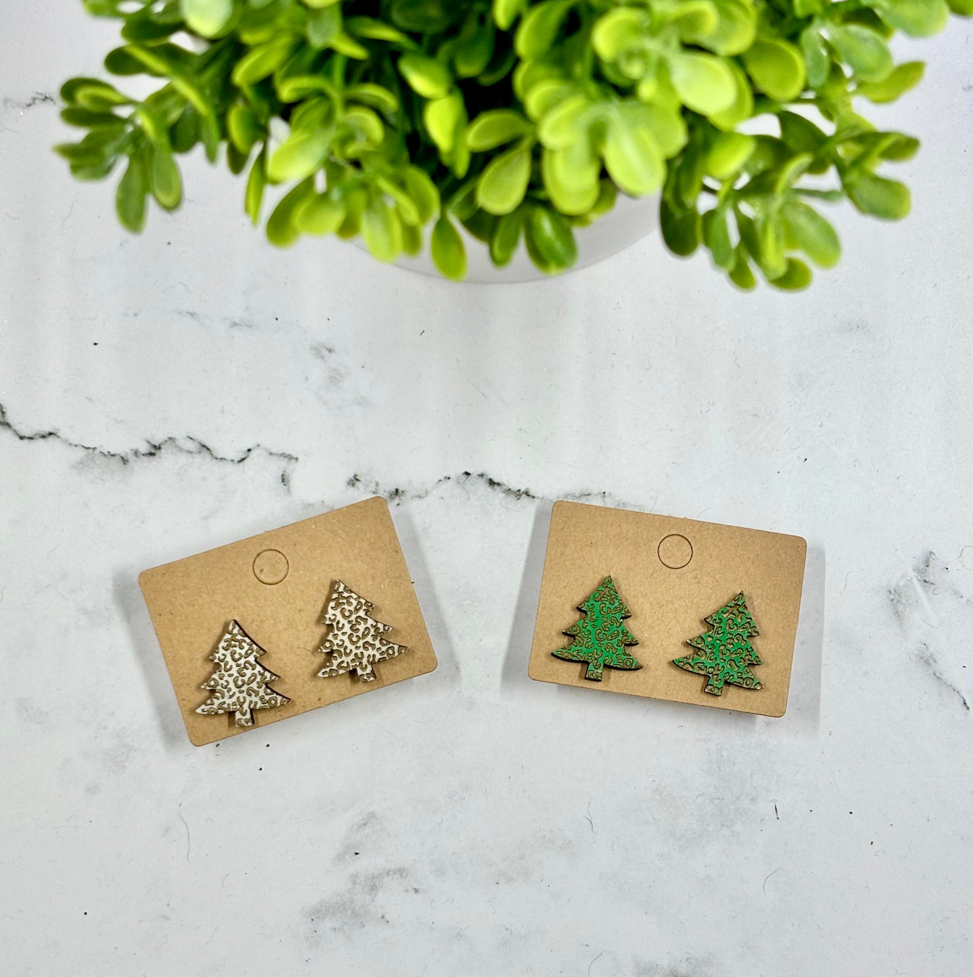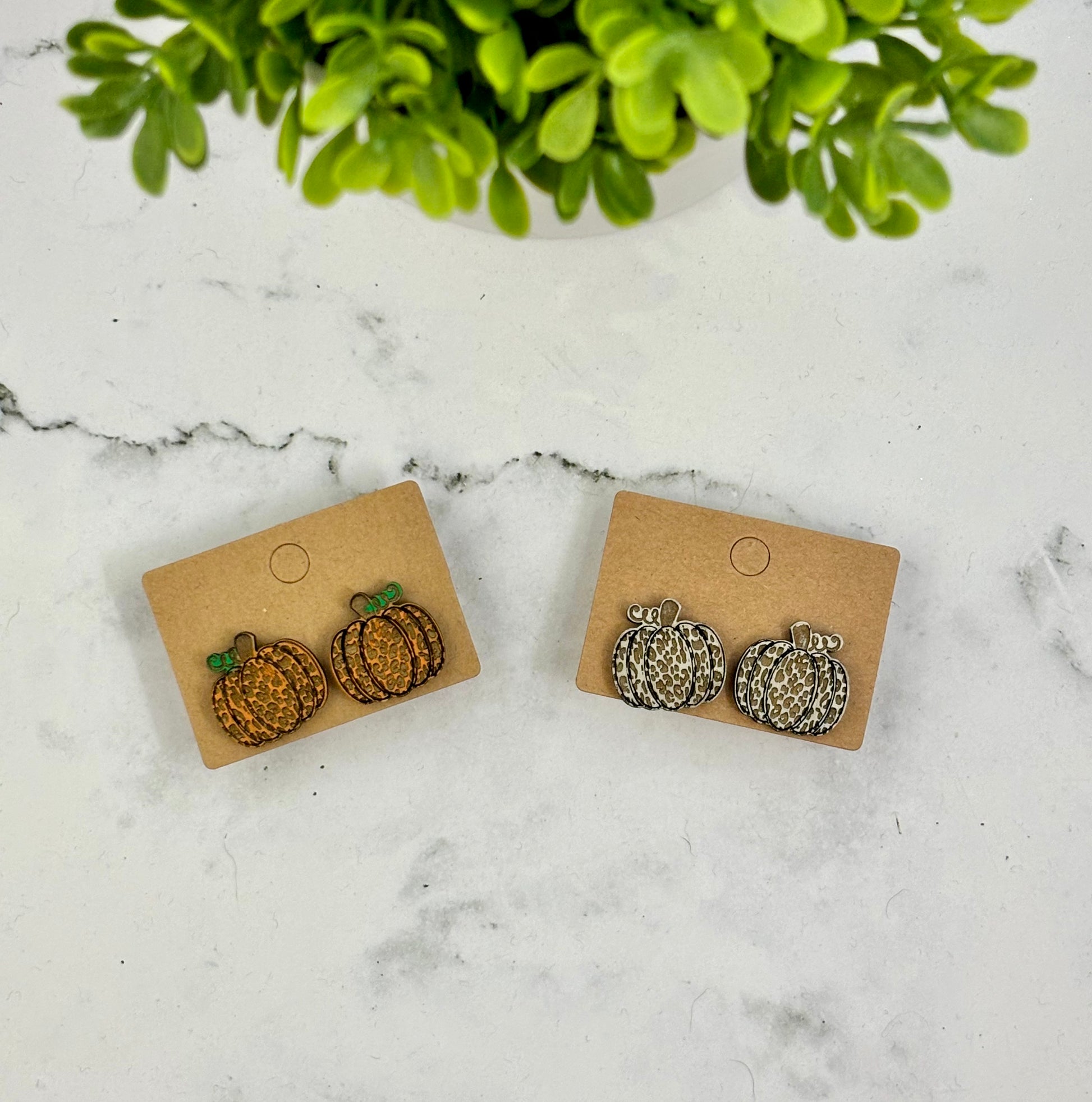 Wooden Stud Earrings in Pumpkins or Trees. These have the leopard print engraved in them and you can choose between white or green trees and white or orange pumpkins!