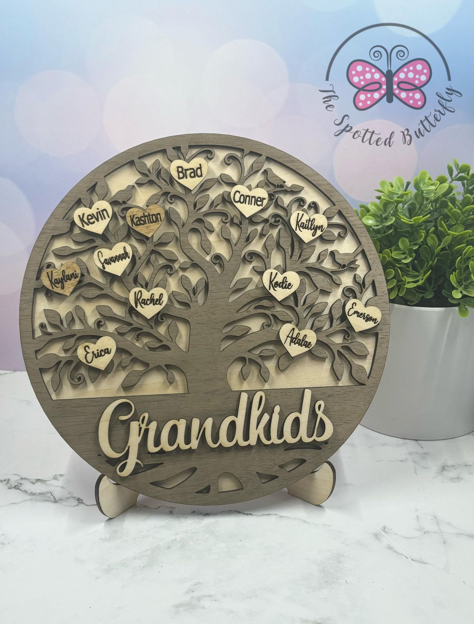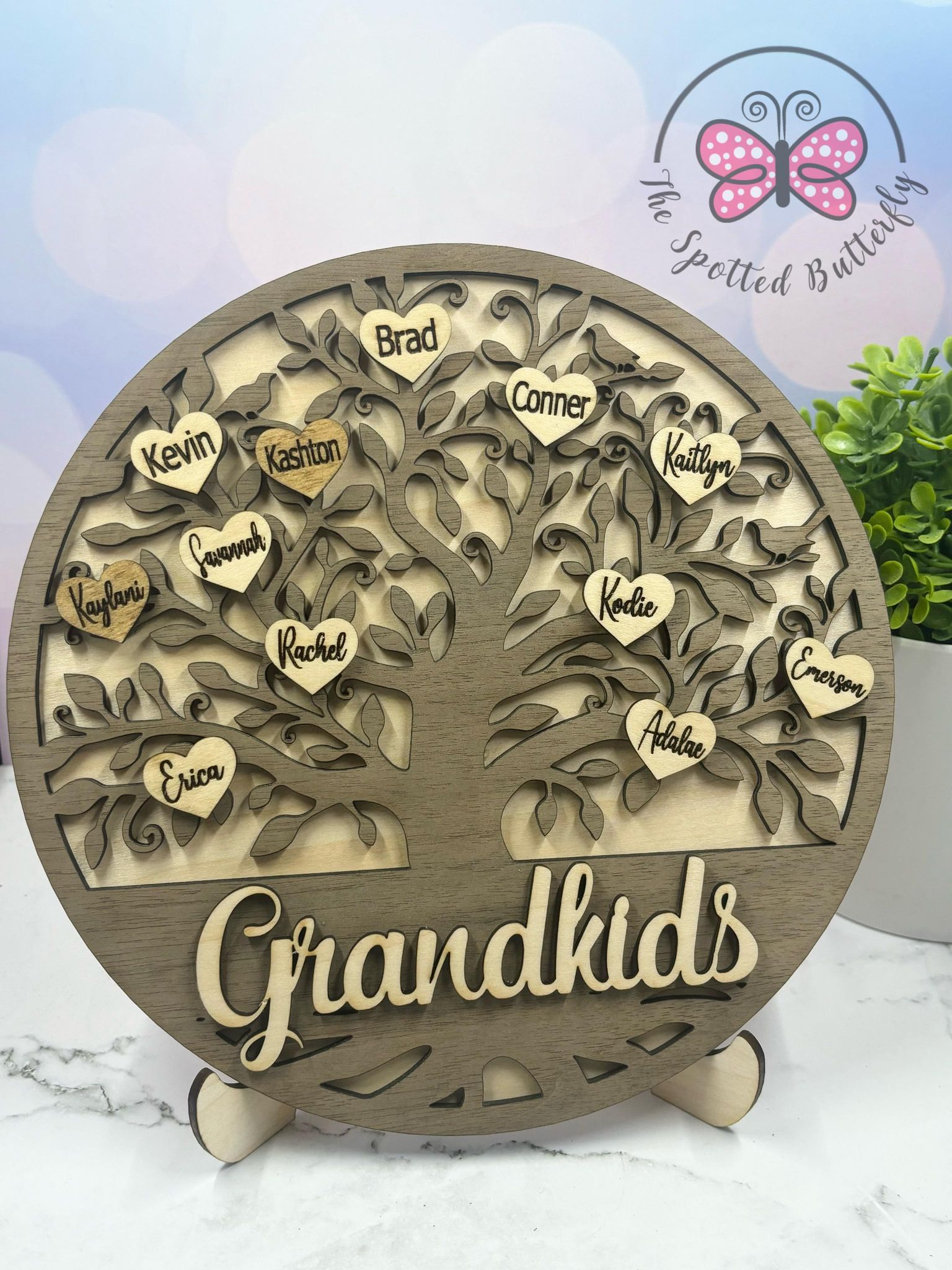 The image shows grandkids in one color and the great grandkids in a darker color. You can choose to stain or paint the wood! PLEASE PUT NAMES IN THE NOTES SECTION OR YOU CAN CHAT OR EMAIL US AT Juliana.Shotwell@yahoo.com.