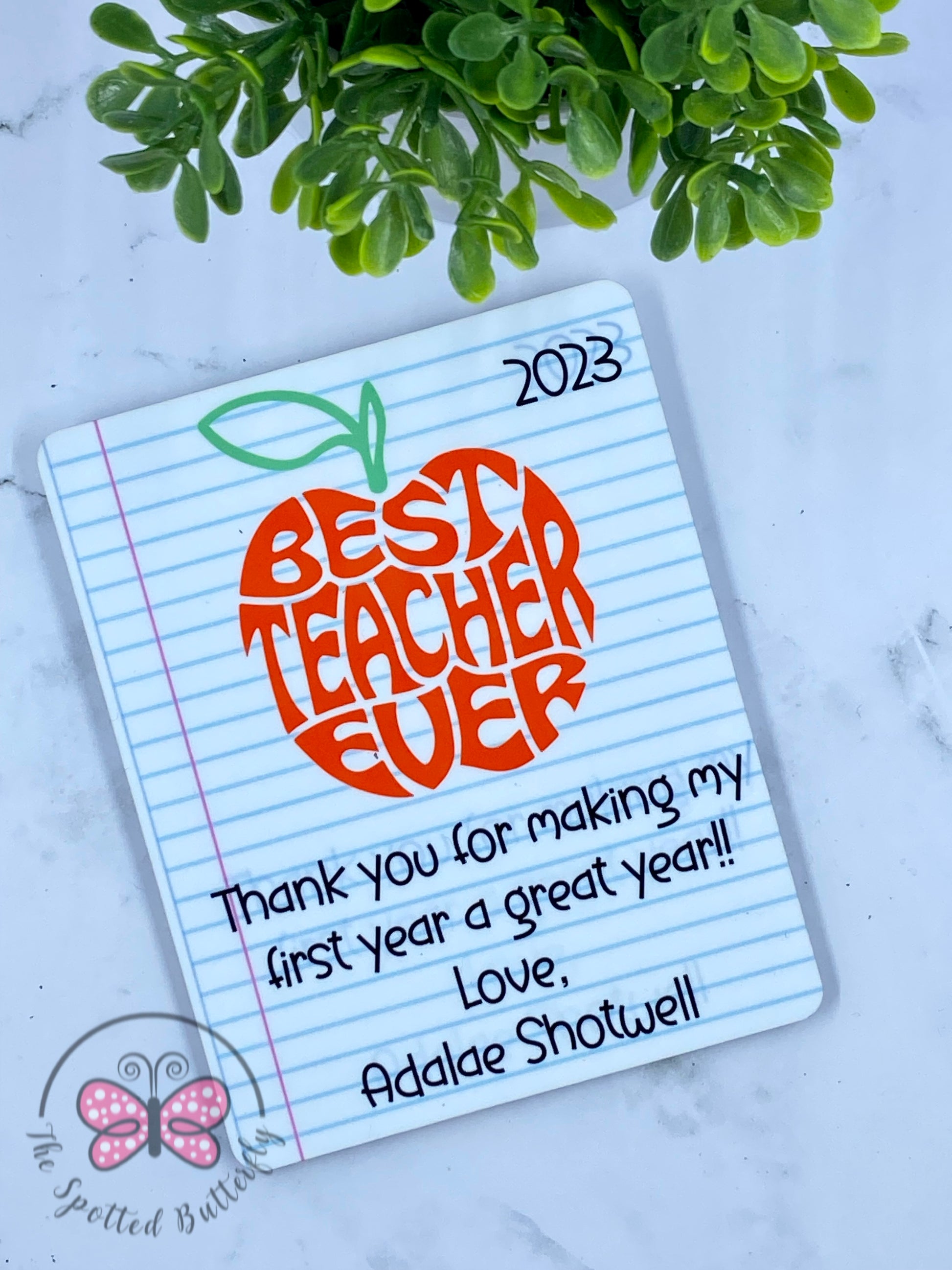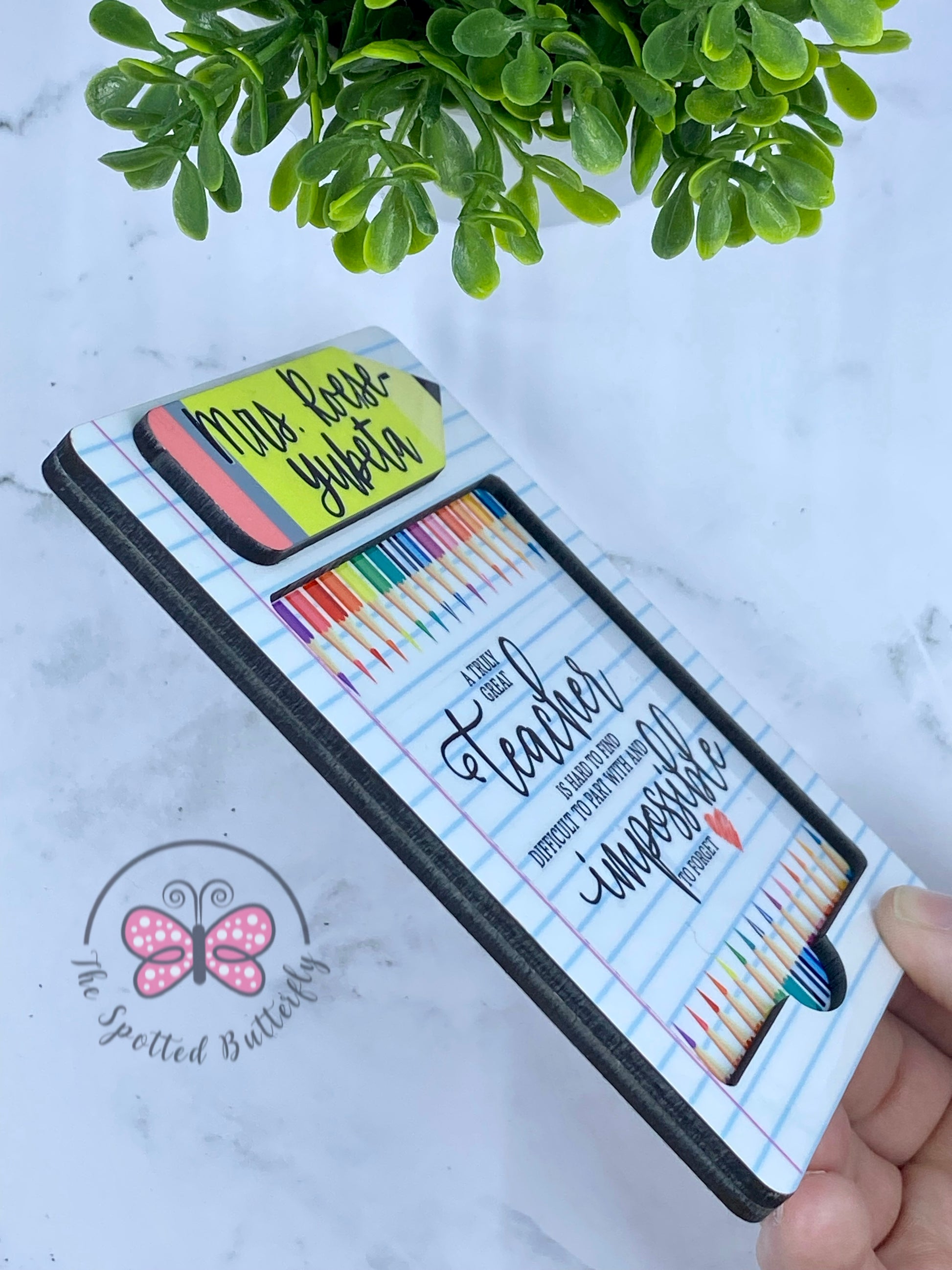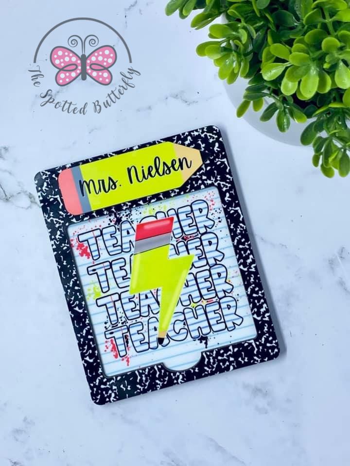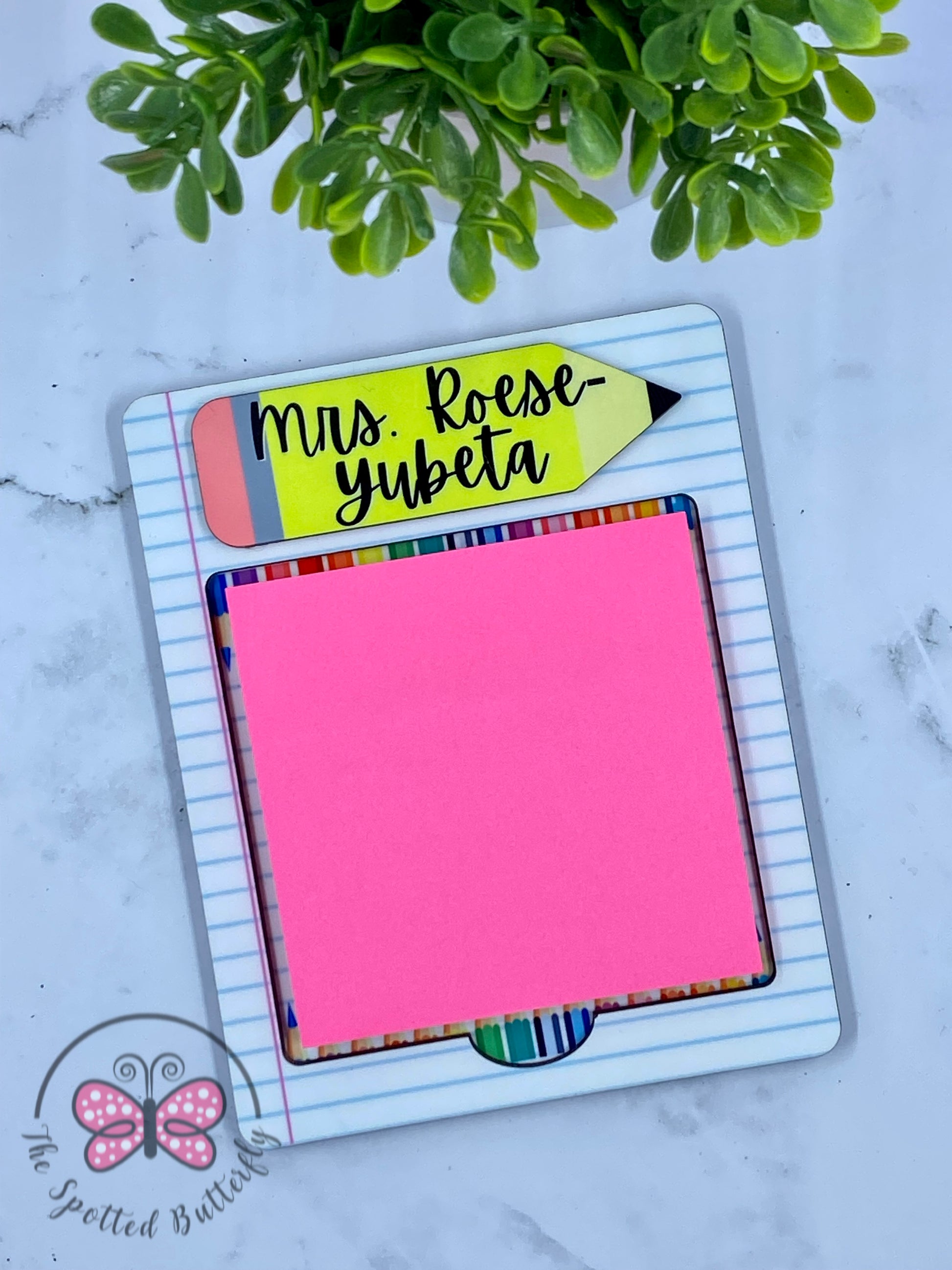 Super fun and cute post it note holder! Holder is made from 2 layers of 1/8" thick MDF. It is approximately 4”x5”. Personalize for the perfect gift for your favorite teacher, administrative assistant, or office worker. If you don’t want the pencil for the name, you could get a rectangle instead! COMES WITH A 3”x3” post it note pack!
