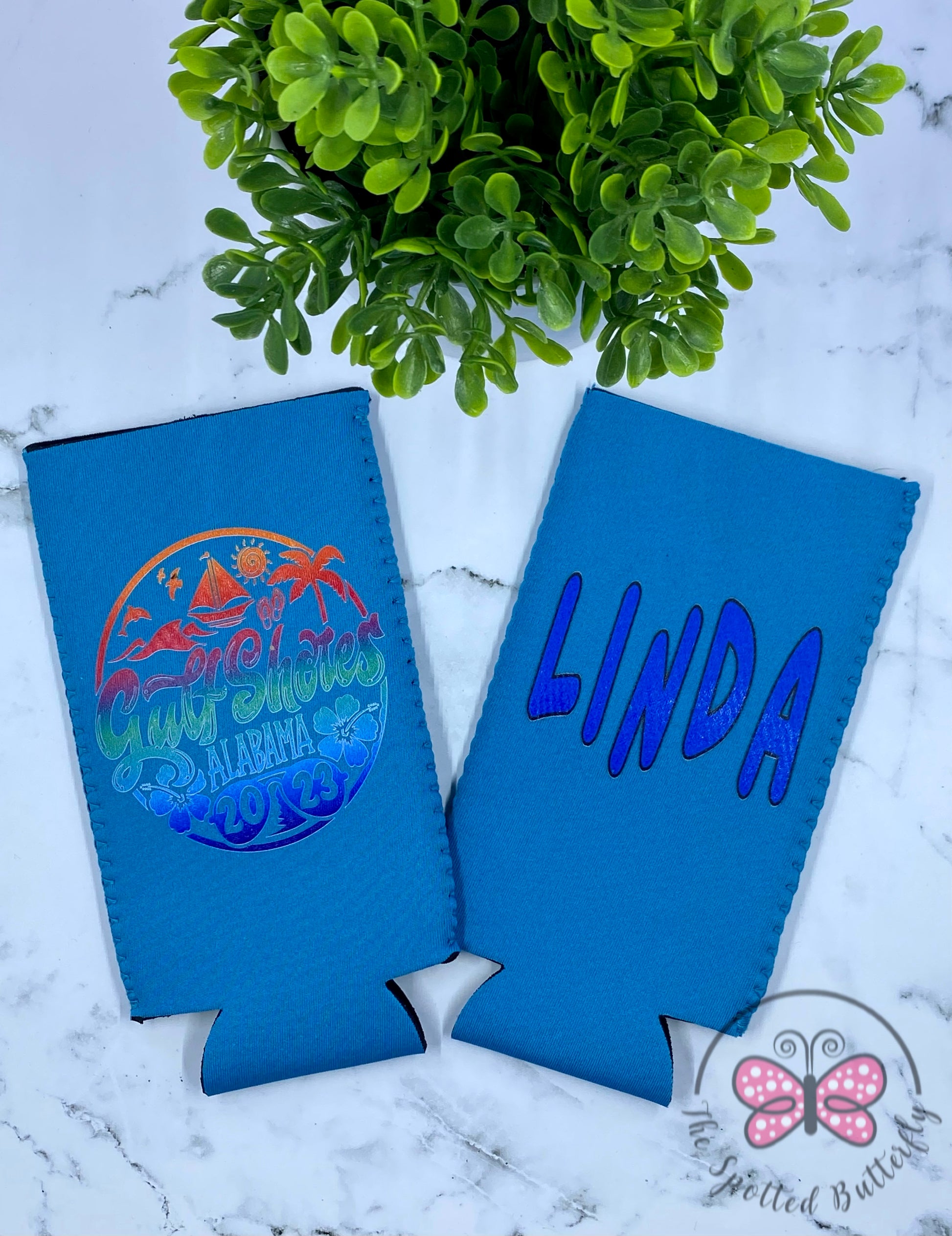 Soft Insulated Reusable Drink Koozies for skinny cans. You can get choose from a variety of colors (pictured). 100% customizable! 5.3"x3" koozies. Either start a chat or email us with your design!