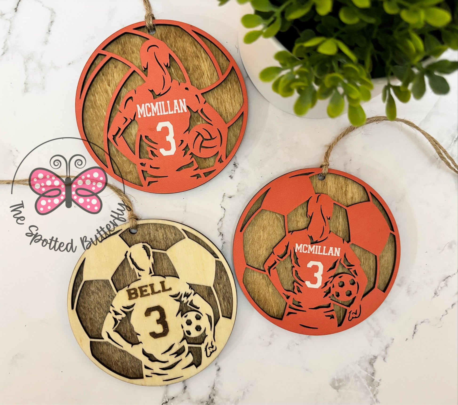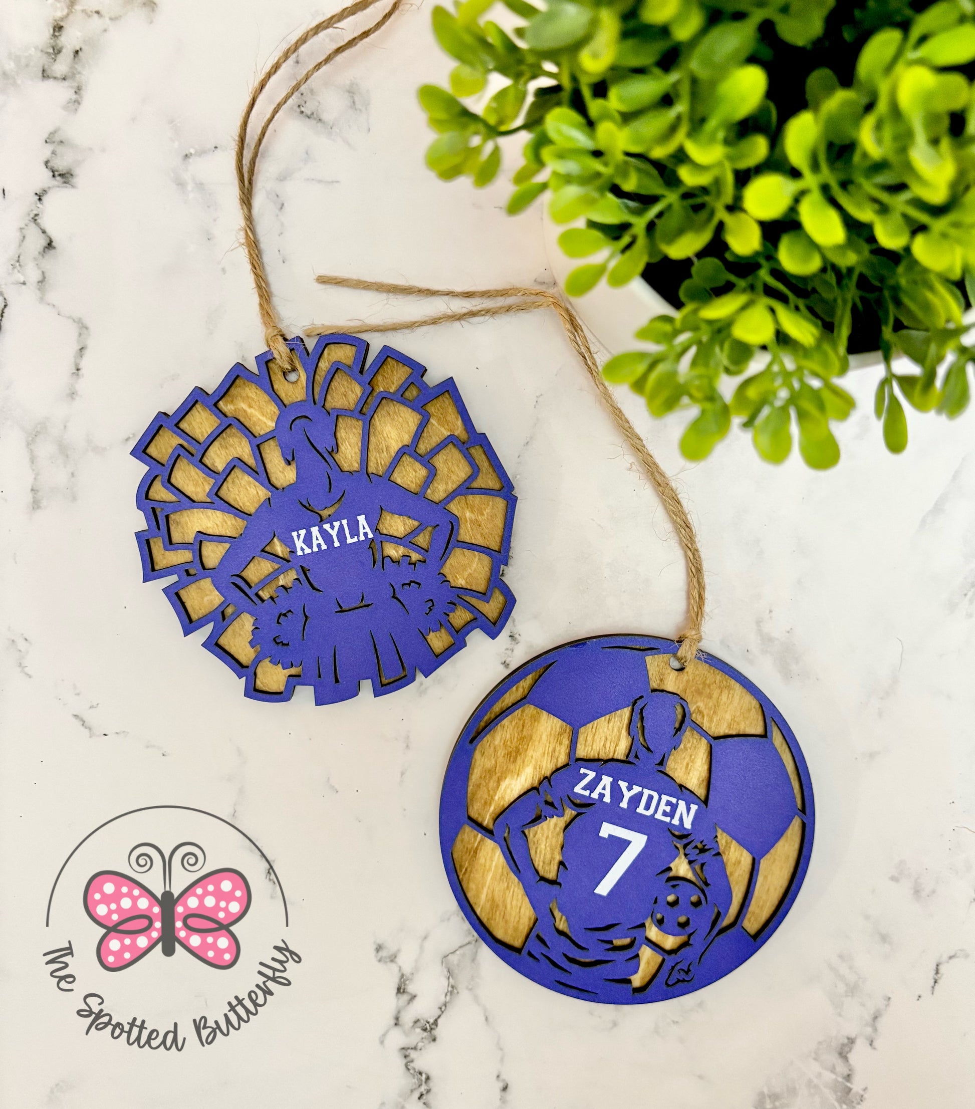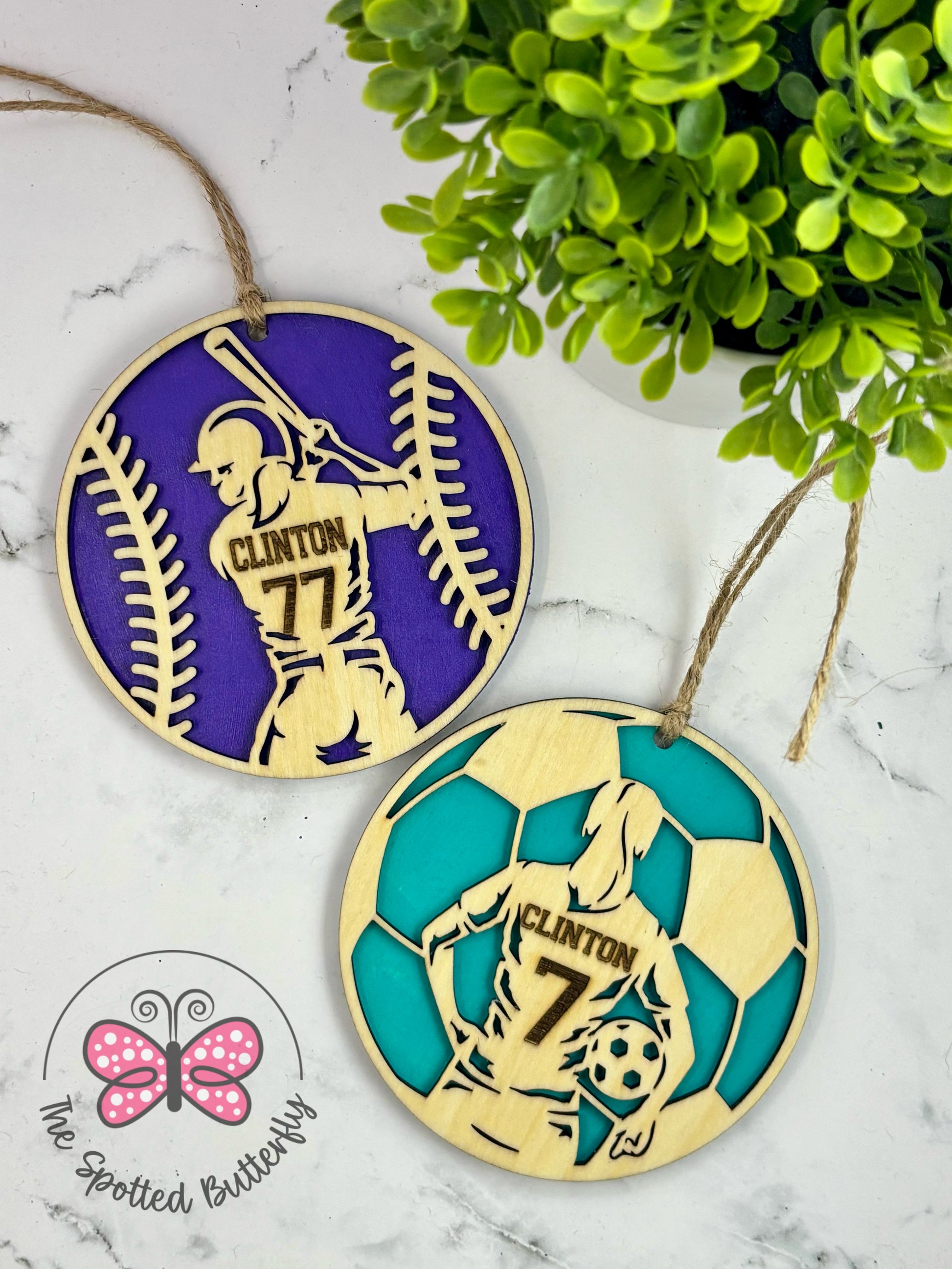Wooden sport ornaments. Can be personalized. Please put the name and # that you would like in the notes at checkout or start a chat!